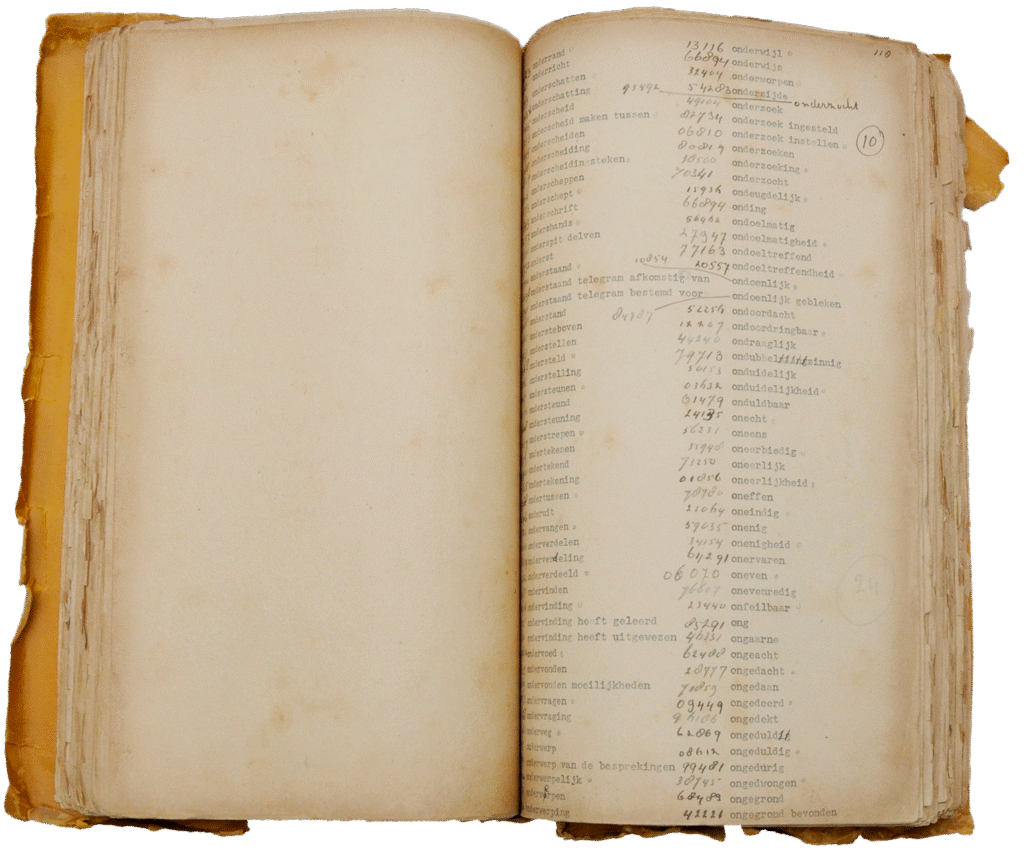 Code C Book is a masterpiece in Museum Sandi. It was compiled by Dr. Roebiono Kertopati in April to May 1946. It contained tens of thousands of passwords that served as communications guidelines for the Code Service under the Ministry of Defense as well as after changing into the Djawatan Sandi Angkatan Perang.