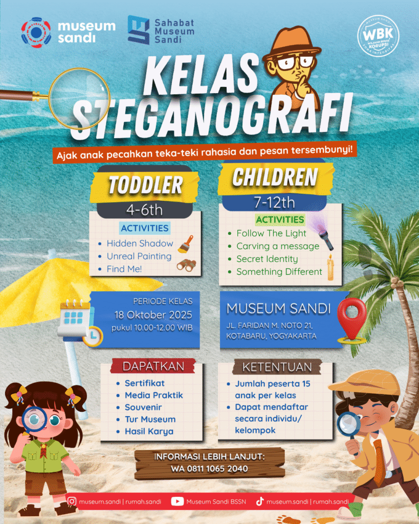 Ajak si kecil menjelajah dunia rahasia di Kelas Steganografi! Melalui aktivitas seru seperti hidden shadow, unreal painting, hingga carving a message, anak-anak diajak memecahkan teka-teki tersembunyi sambil belajar konsep dasar pesan rahasia. Dapatkan sertifikat, media praktik, hasil karya, dan pengalaman tur museum yang menyenangkan. Kelas ini terbuka untuk anak usia 4–12 tahun dan dapat diikuti secara individu maupun berkelompok.